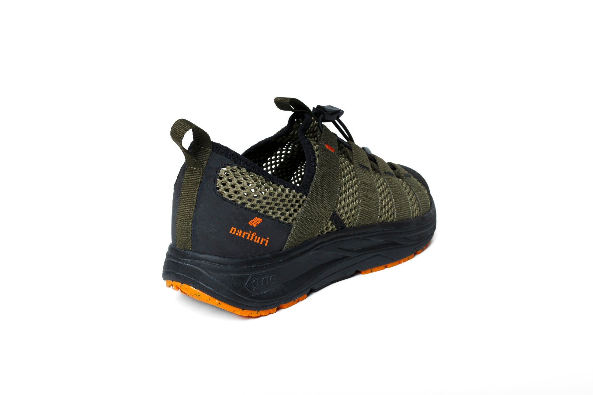 コラボレーションモデルは、rig のインラインには存在しないカーキカラーをベースにオレンジとブラックを差し色としたカラーに仕上げました。また、機能面では車道を走る自転車乗りにとって重要な被視認性の確保の為に、踵にリフレクタープリントを施した特別な仕様になっています。 narifuri が提案する『EASY RIDE』にふさわしいコラボレーションシューズです。