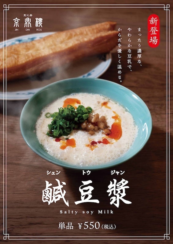 株式会社 JIN DIN ROU(本社:東京都品川区、代表取締役 荻巣雄太)は京鼎樓(ジンディンロウ)恵比寿本店で『鹹豆漿(シェントウジャン)』を始めとする台湾の朝ごはんを販売開始いたします。