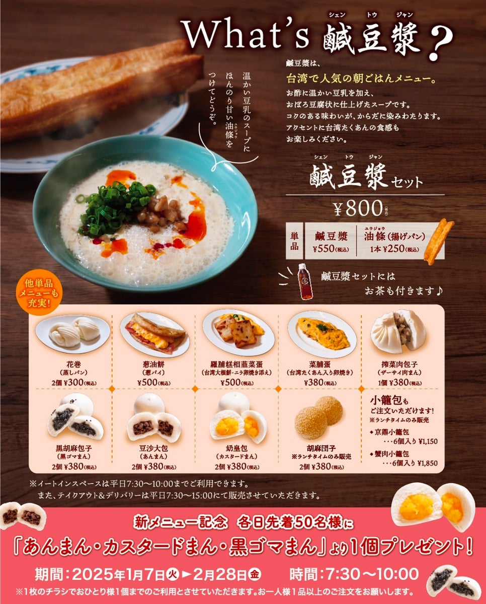 2025年1月7日(火)7:30〜【京鼎樓(ジンディンロウ)恵比寿本店で台湾の朝ごはんが楽しめる】朝テイクアウトがSTART!