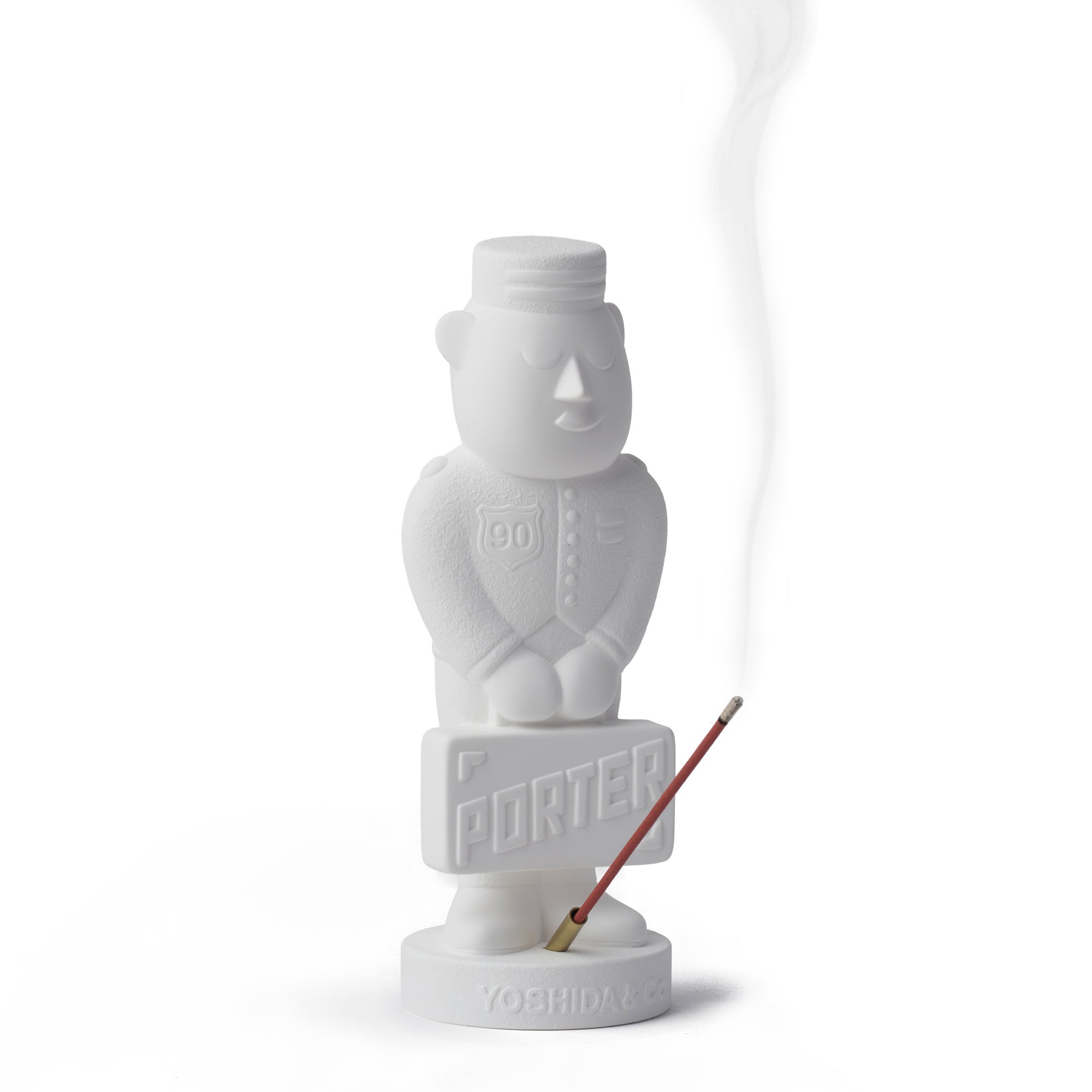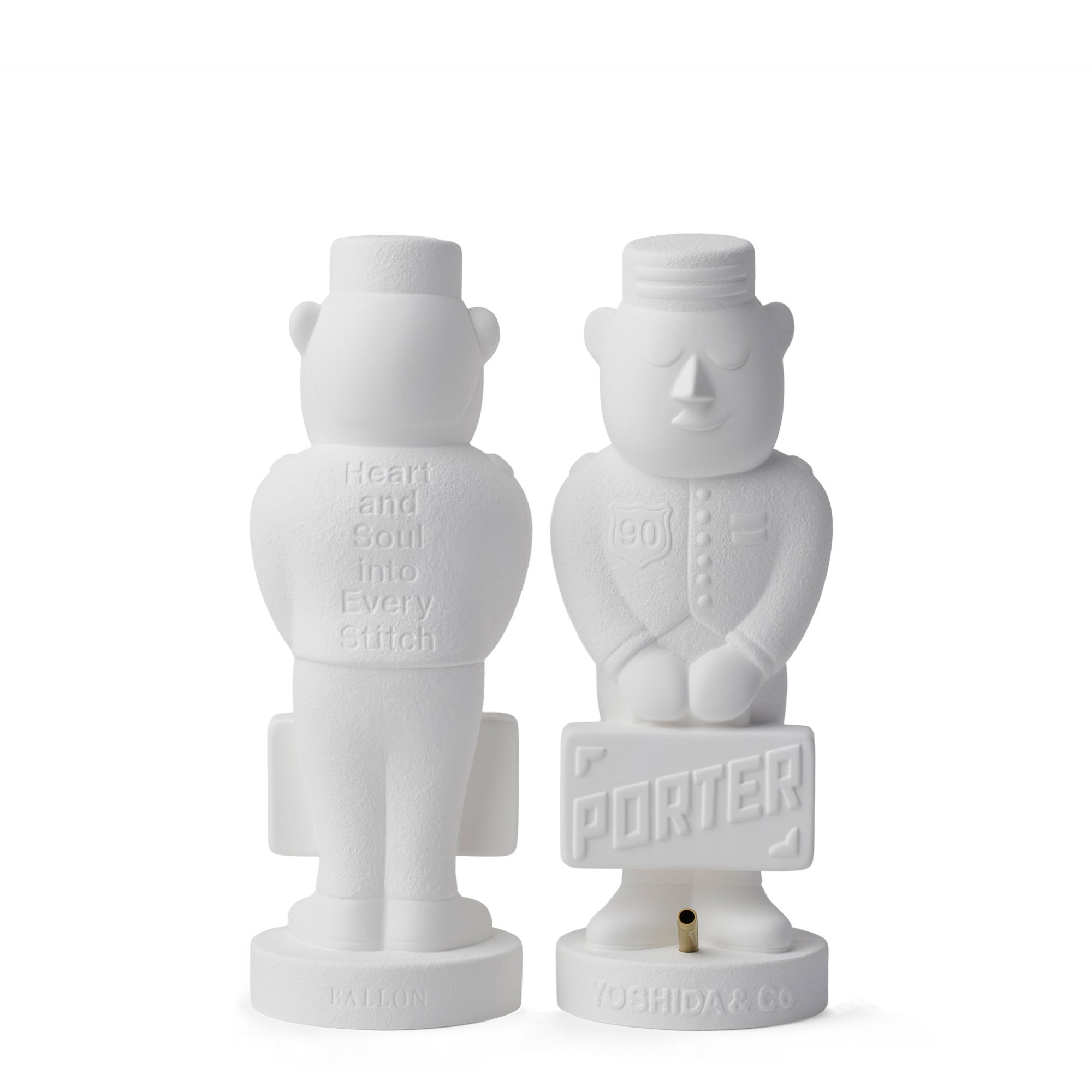 PORTERの店頭でにこやかに出迎えてくれるキャラクター「ポーターくん」を石膏で表現しました。ポーターくんの胸には 90 周年のエンブレム、背中には吉田カバンのモットーである「一針入魂」を意味する「Heart and Soul into Every Stitch」の文字を施しています。 石膏表面はさらっとした艶やかな面と、素材感の残るきめの粗い面を使い分け、立体感が出るようこだわりました。