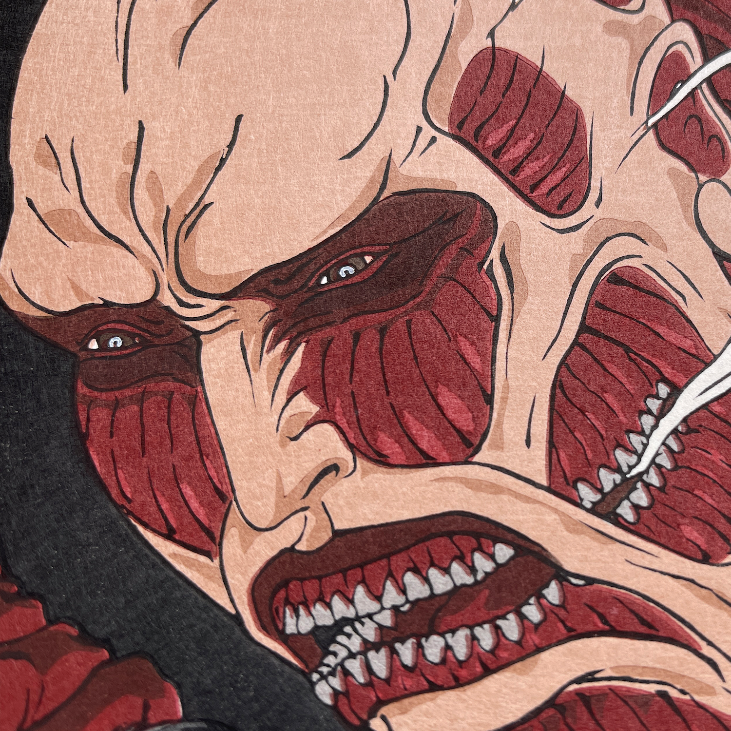江戸時代後期を牽引し、 「奇想の絵師」と呼ばれ現代でも絶大な人気を誇る浮世絵師 歌川国芳。彼の代表作「相馬の古内裏」(1845-46)は、源頼信の家臣、大宅太郎光国ががしゃ髑髏を退治している様子を描き、その独特の構図や迫力から、現在でも絶大な人気を誇る日本の浮世絵界屈指の名画です。今回は日本画家の塩崎顕氏が、こちらの名画と進撃の巨人の世界観を見事にマッチさせた原画を描き下ろし、約200年の時を経た日本を代表する作品同士のコラボレーションが実現しました。