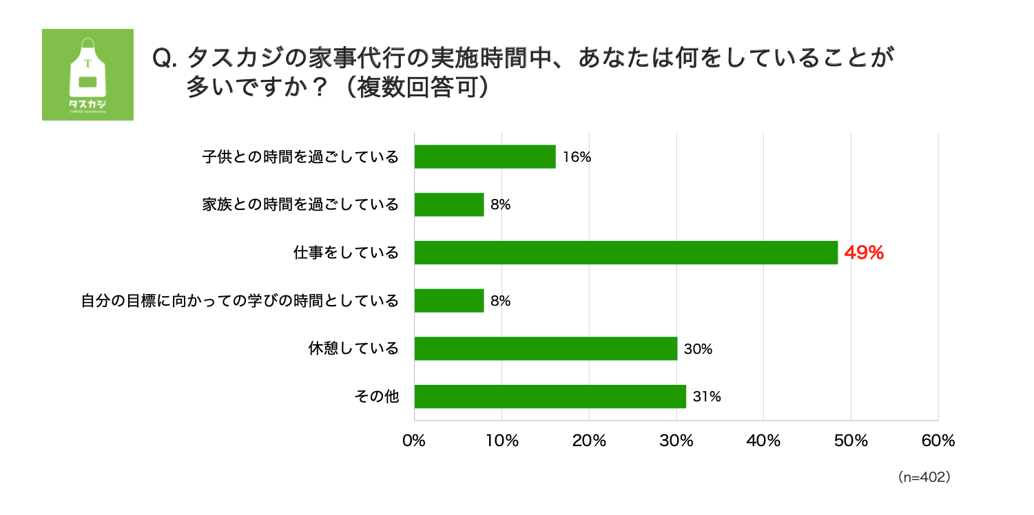 ・タスカジの家事代行の利用中は、約半数が「仕事をしている」と回答。その他、「休憩している」が30%、「子供との時間を過ごしている」が16%だった。