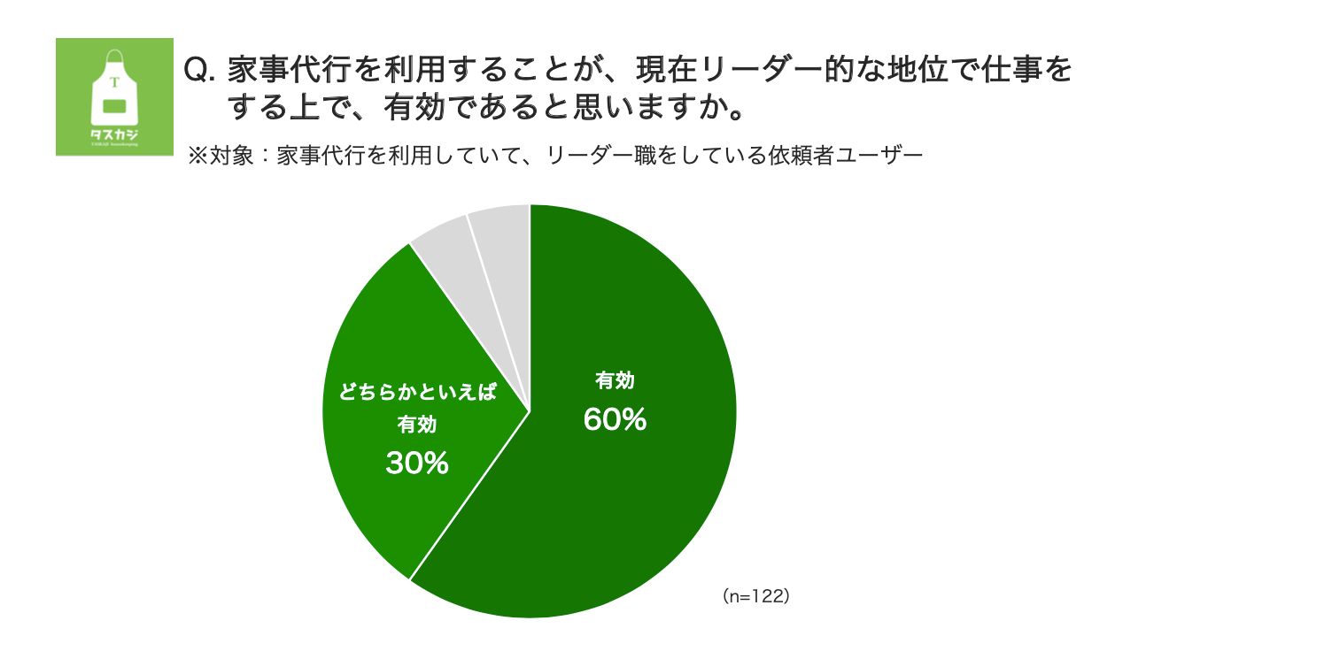 現在リーダー的ポジションで仕事をしている人の9割が、家事代行を利用することが「有効、どちらかといえば有効」と回答しました。