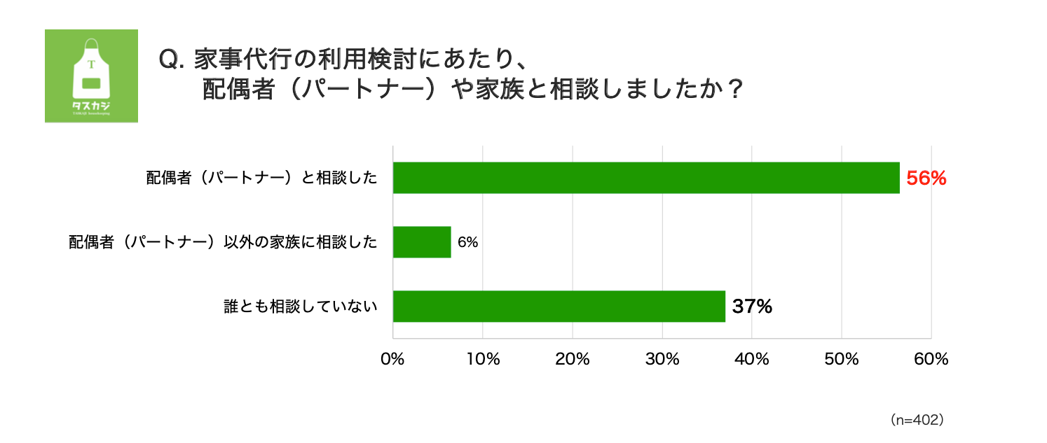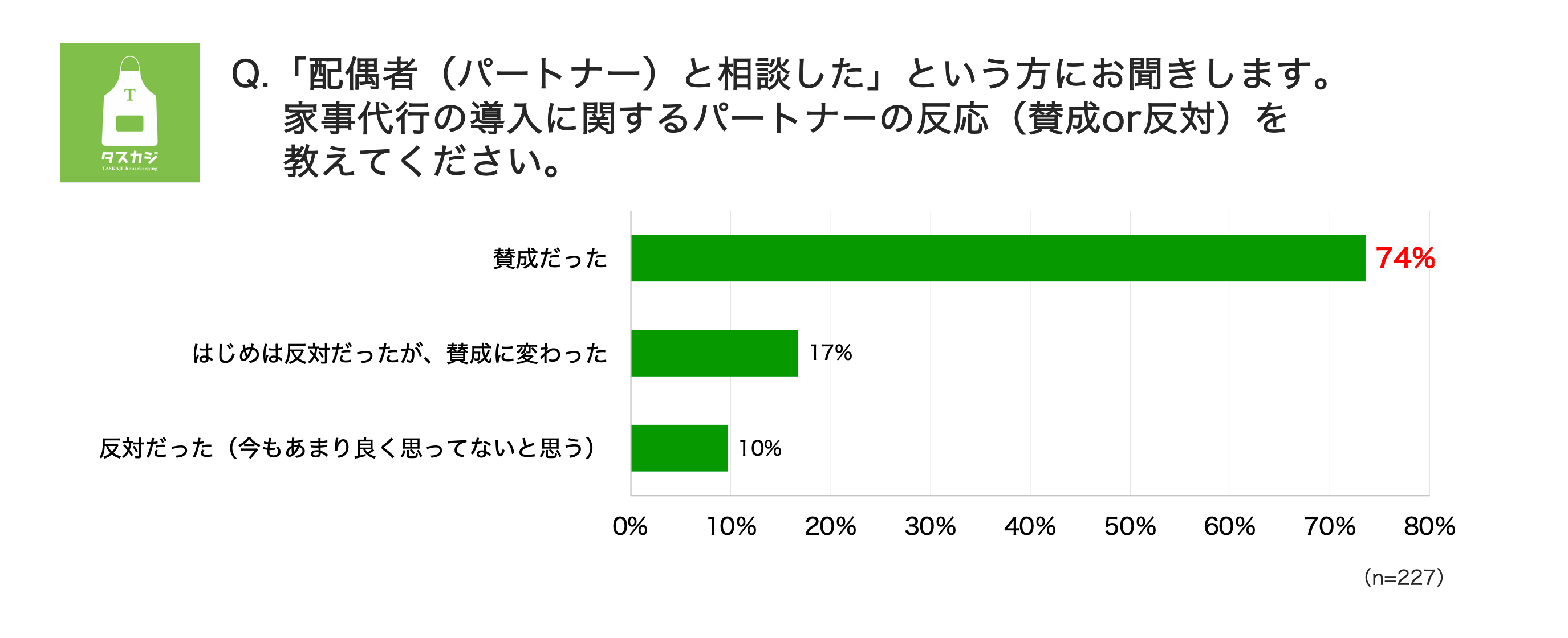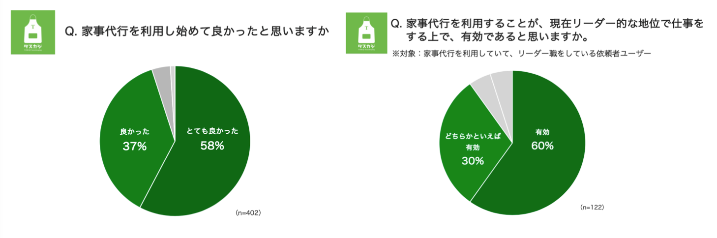 今回の調査では、家事代行の利用を始めるまで、依然として半数以上の人が抵抗感を持っていることがわかりました。一方、利用前に抵抗感を持っていた方も、使ってからは9割以上の人が「家事代行を使って良かった」という感想を持っていることが明らかになっています。また、現在リーダー職で仕事をしているユーザーの9割が、リーダー的ポジションで仕事をする上で家事代行の利用が有効であると回答し、キャリア形成にも役立つこともわかりました。