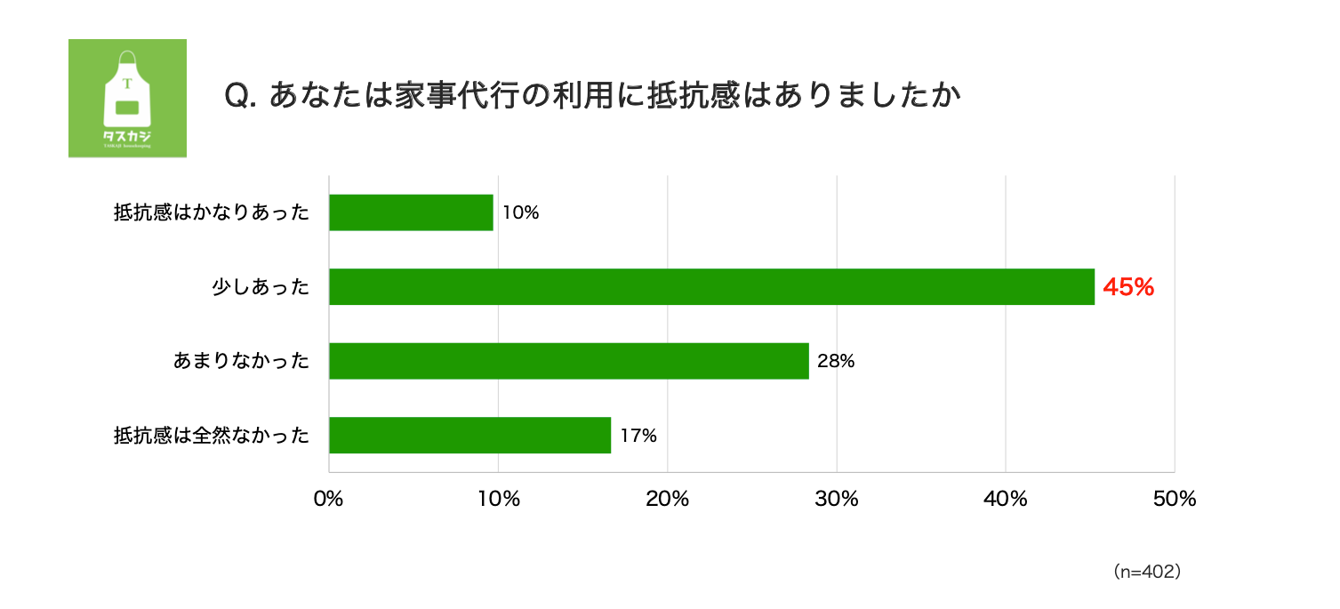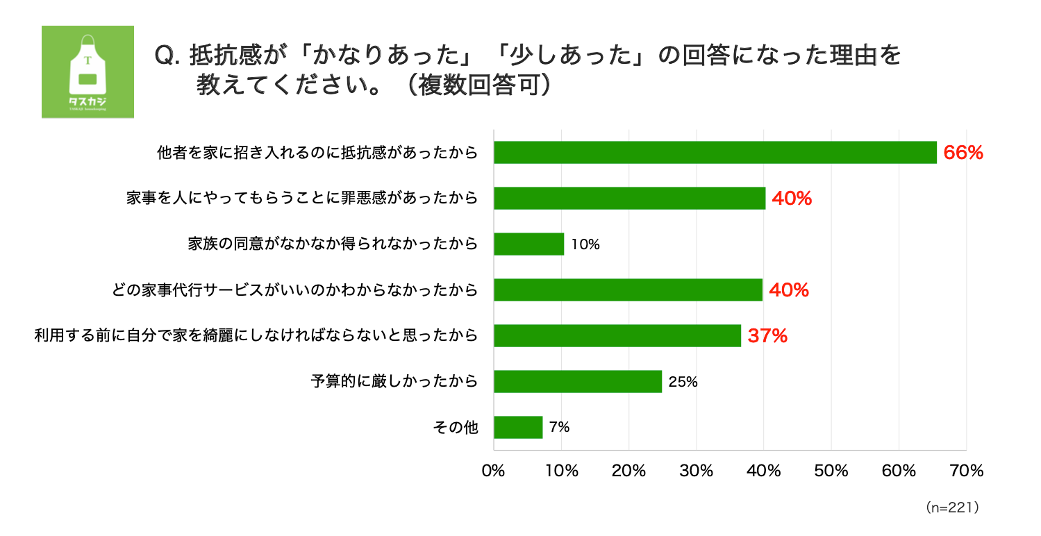 抵抗感があった理由として、66%もの人が「他者を家に招き入れるのに抵抗感があったから」と回答、続いて「家事を人にやってもらうことに罪悪感があった」が40%、「どの家事代行サービスがいいのかわからなかった」が40%、「利用する前に自分で家を綺麗にしなければならないと思った」が37%と続きました。