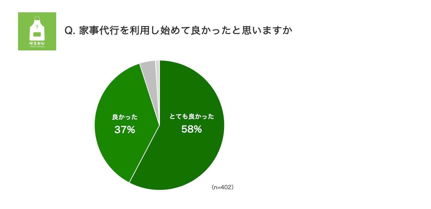 家事代行を利用し始めて、95%の人が「とても良かった」「良かった」と回答。それぞれの生活において、家事代行の利用は満足度が高いことがわかりました。