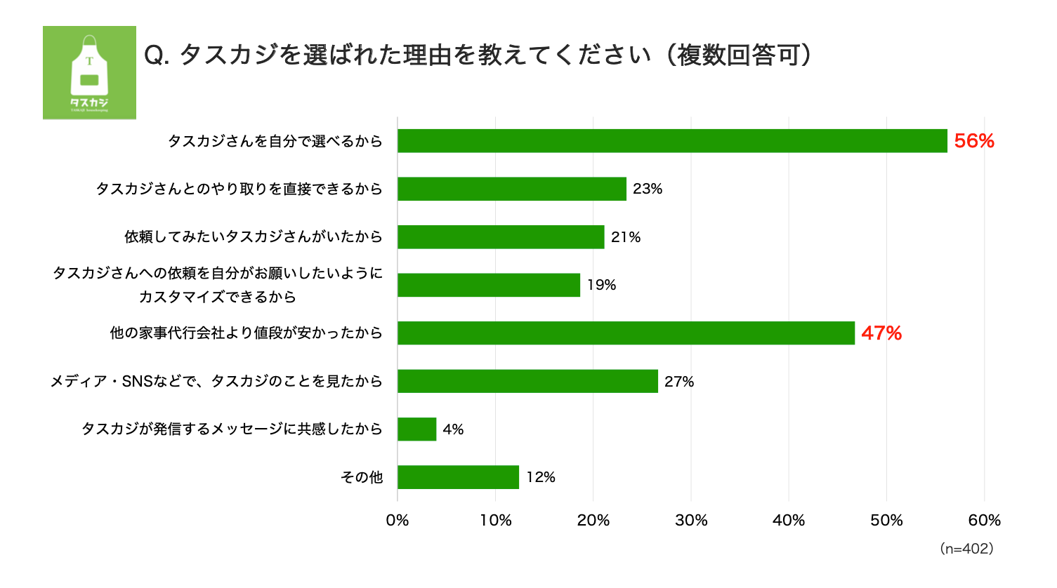 数ある家事代行会社の中からタスカジを選んだ理由として、マッチングプラットフォームの最大の特徴である「タスカジさんを自分で選べるから」が最も多く、56%でした。続いて、「他の家事代行会社より値段が安かったから」が47%となりました。
