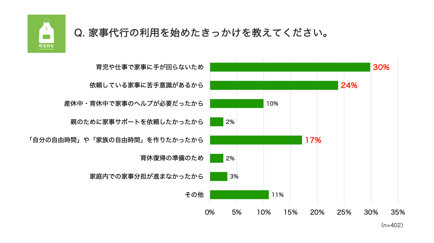 ・家事代行利用のきっかけとして、「育児や仕事に手が回らない」が30%で最も多く、続いて「依頼している家事に苦手意識がある」が24%、「自分や家族の自由時間を作りたい」が17%と回答。