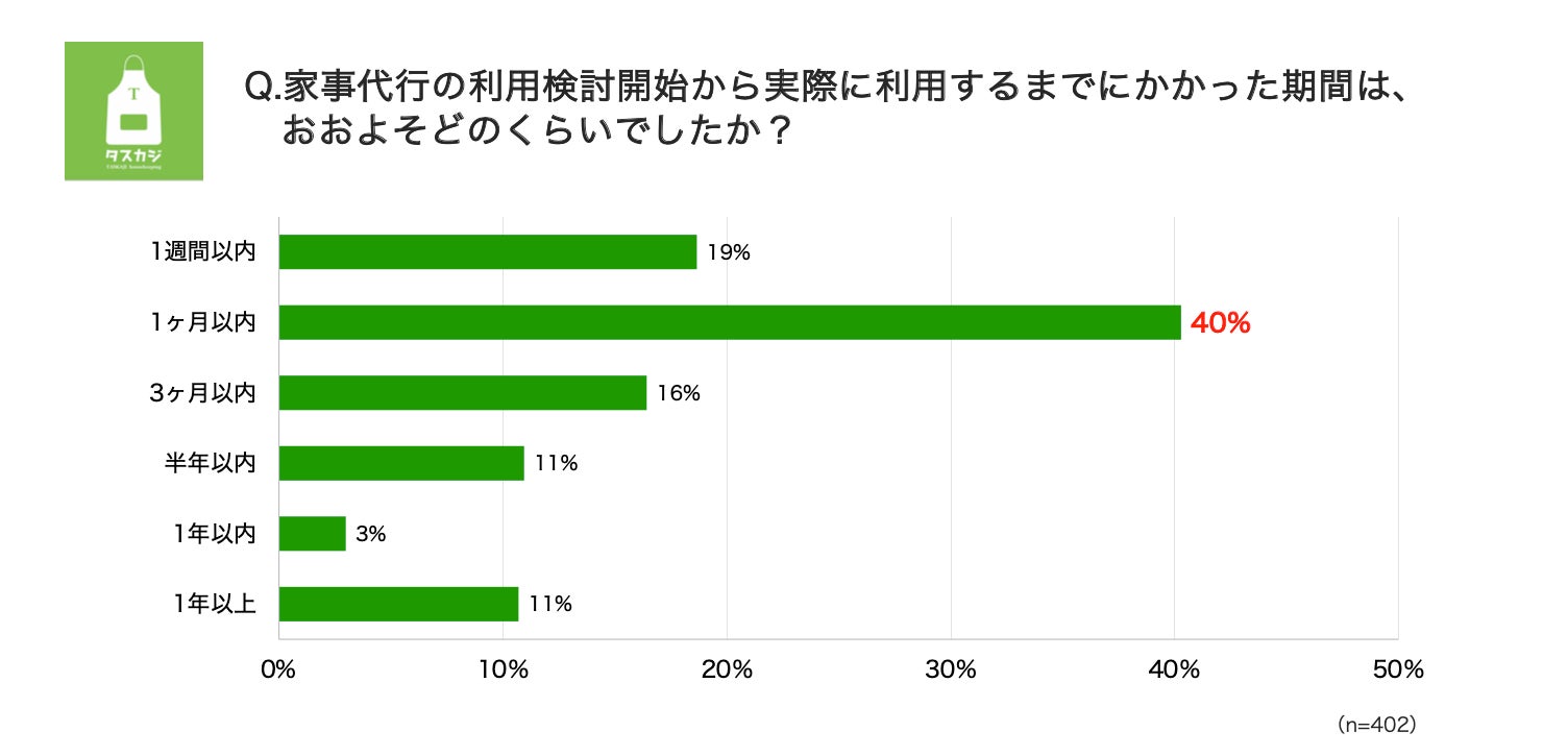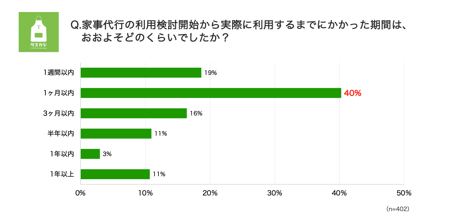 ・家事代行の利用を検討してから開始までの期間が、1ヶ月以内だった人が最も多く40%と回答。