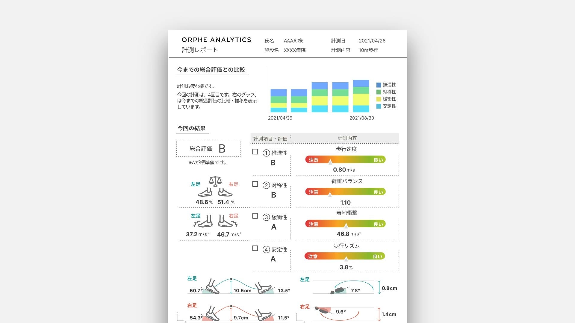 計測後にはレポートが出力され、経過の比較情報やわかりやすい5段階評価・豊富な指標などが表示されます。患者様の状態を定量的な計測データで正確に把握できるので、医療従事者間でのコミュニケーション効率が向上するだけでなく、患者様との目標設定や目標達成度の評価にも役立ちます。治療効果の見える化で患者様とのコミュニケーションをサポートします。