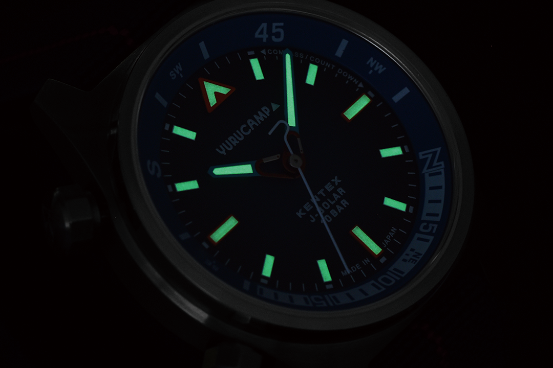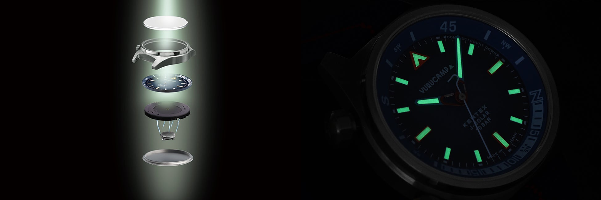 本モデルは、信頼の日本製ソーラー発電式ムーブメントを搭載。フル充電時、最大4ヵ月間の稼働で電池交換が不要。時計の針とインデックスにスーパールミナス(強蓄光)を施し、夜間でもしっかり視認性を確保。
