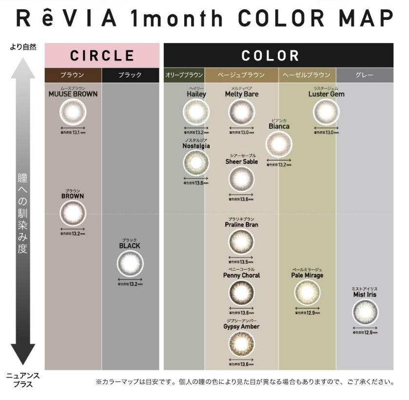 自然 な美しい瞳になれるようにデザインやイメージごとに着色直径を変えた レンズラインナップ。