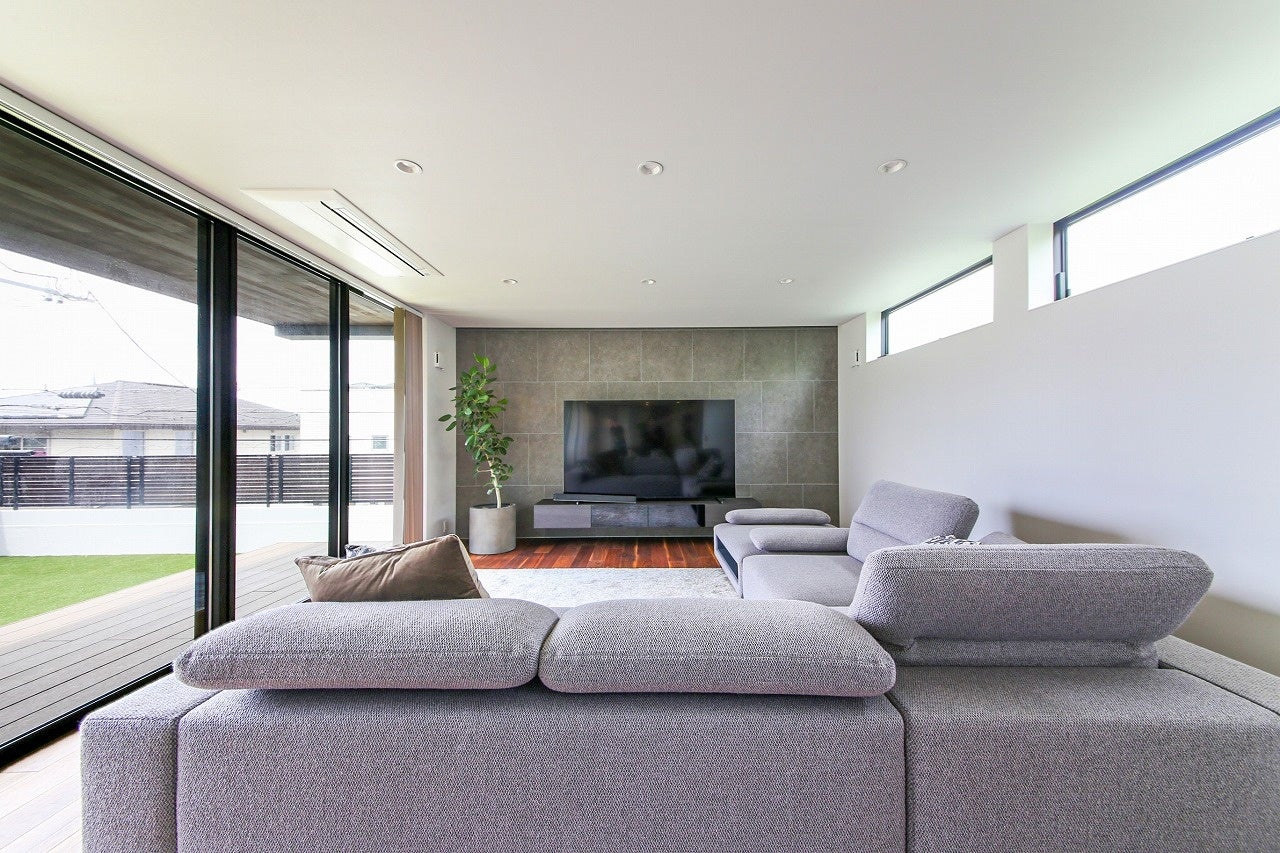 30帖のLDKは、ダイニングとリビングの間に3本引き戸を設け、空間に可変性をもたせました。 モダンテイストでありながら木を採り入れたいというご希望から、温かみを出しつつも木のボリュームを多くし過ぎないように配慮。例えばリビング天井に木を貼りたいというご希望もありましたが、天井高や空間の形状等の条件から、天井ではなく軒天に木を貼るようにするなど、バランスのよいデザインに仕上げています。