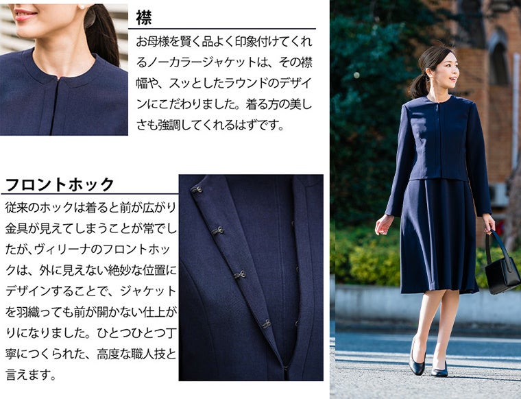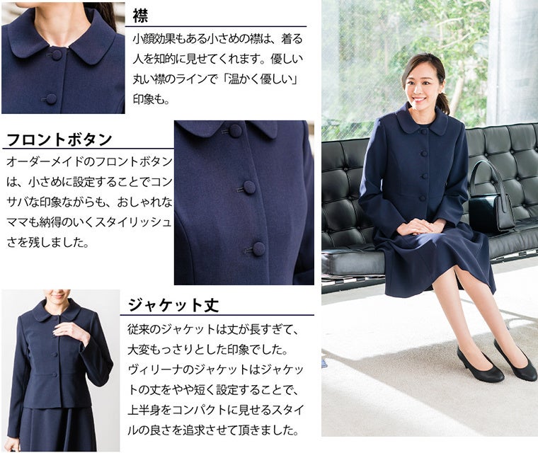 ヴィリーナ ジャパン(株)(東京都港区/代表取締役 青木愛/http://www.virinamaternity.com)は、自身の子供達の受験(小学校受験/中学校受験  私立・国立・女子校・男子校)を経験する中で、お受験本番の面接1回きりしか着ていく場所がない、面接用のお受験スーツについて疑問を持ち、お受験だけでなく、保護者会や入学式、卒業式、式典など、多くの行事にも「着ていきたい」と思えるデザインを考案しました。また窮屈で緊張を助長するような着心地ではなく、リラックスして自然体でいられるような着心地の良さを追求し、上品なウール見えしつつ動きやすい、業界初のストレッチ素材を厳選。ストレッチの効いた動きやすさは舞踊や体操などの親子考査のあるお受験にも大変役に立ちます。