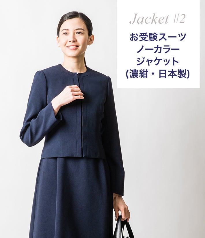 シンプルでスタイリッシュに見える「ノーカラージャケット」は、丸襟が苦手な方にもおすすめです。ジャケットだけ単品でも普段にご使用できますので、お受験当日だけにならないジャケットは賢い選択でも。お受験で間違いのない、好感度の高いジャケットであることはもちろん、その後も楽しくお召いただけるところもポイントです。