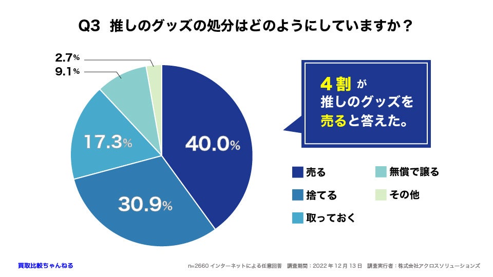 Q3 推しのグッズを処分する時「売る」という人が一番多く40.0%。