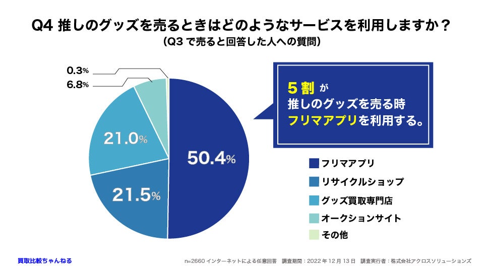 Q4 推しのグッズを売るときに「フリマアプリ」を利用するという人が50.4%で一番多い。