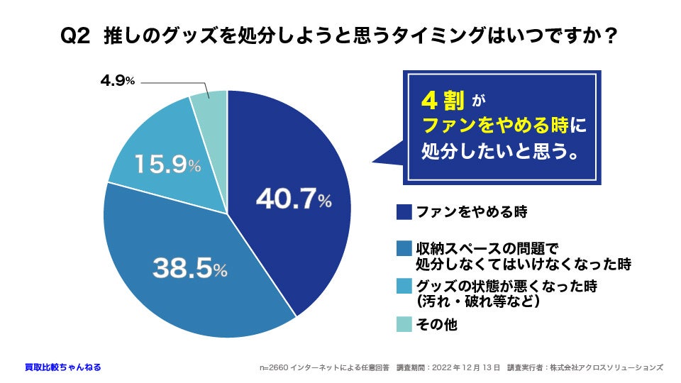 Q2 推しのグッズを処分しようと思うタイミングは「ファンをやめる時」が40.7%で一番多い。