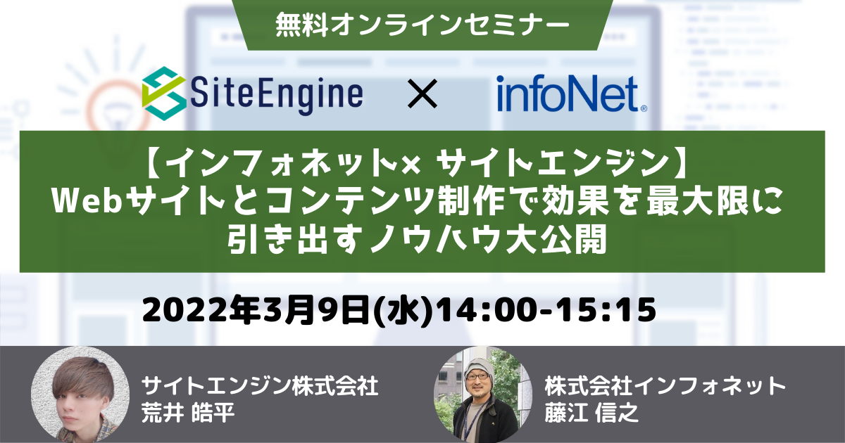 サイトエンジン株式会社 3月9日に株式会社インフォネットとの共催オンラインセミナー ” 【インフォネット×サイトエンジン】Webサイトとコンテンツ制作で効果を最大限に引き出すノウハウ大公開” を開催