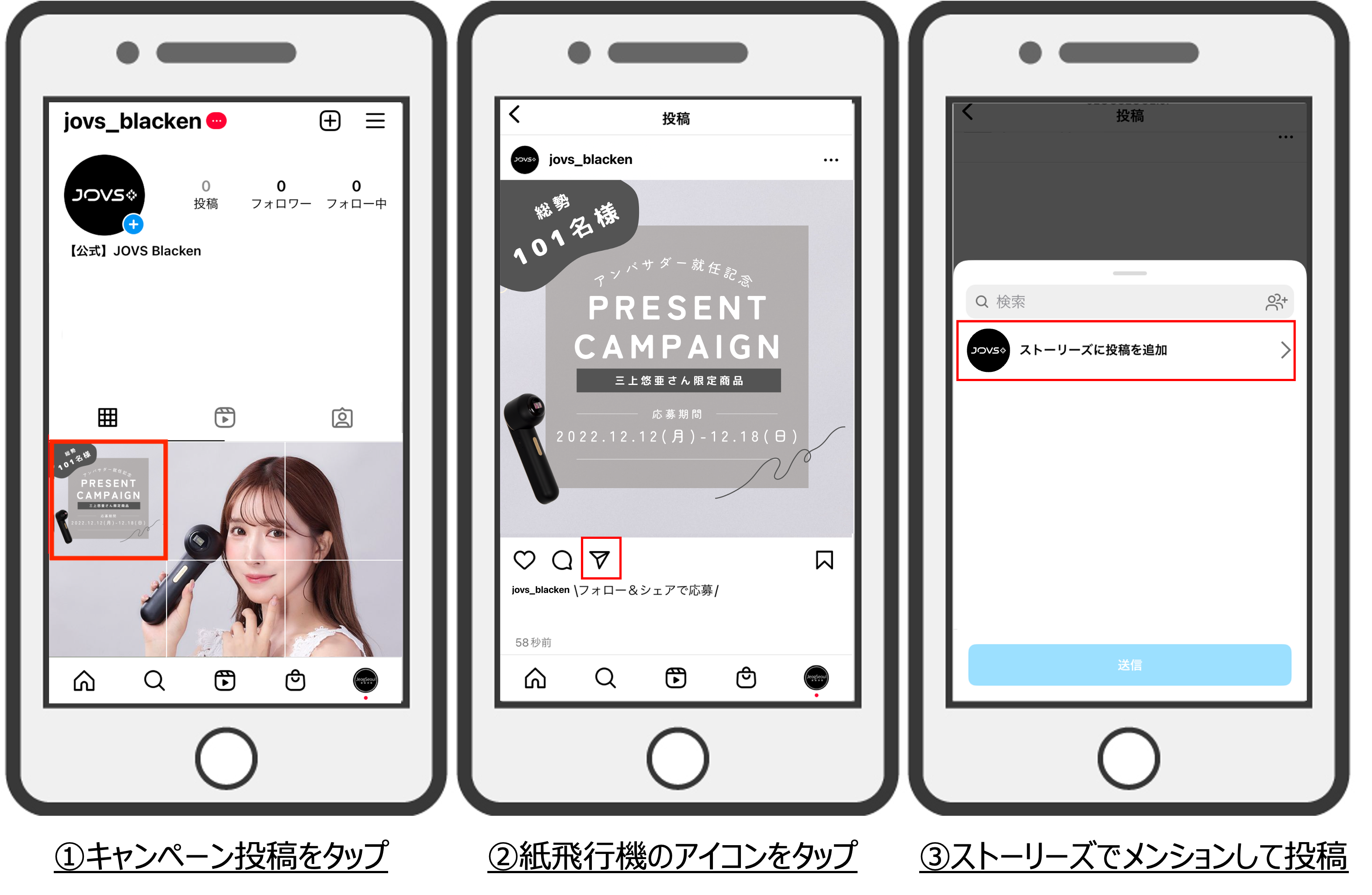 ・プレゼントキャンペーンの投稿を、ストーリーズで「@jovs_blacken」をメンションしてシェア。
