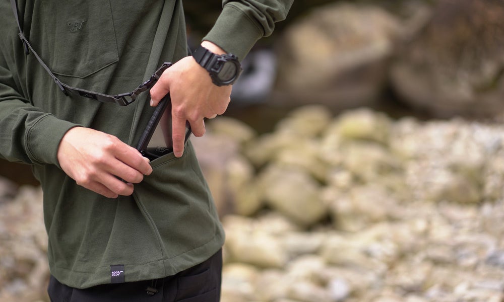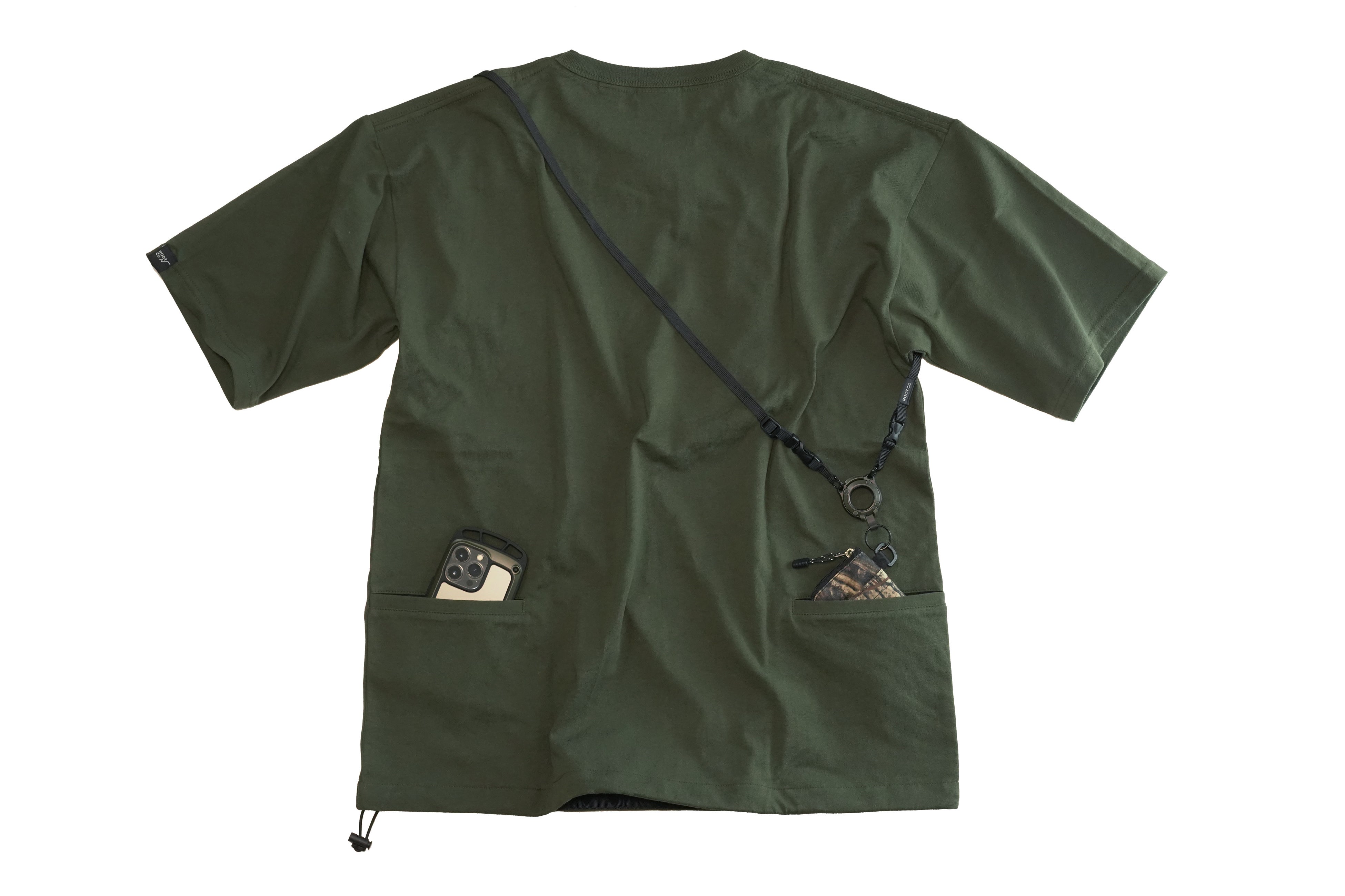 バック(背面)両サイドにポケットを配した、ROOT CO.オリジナルの機能性Tシャツ。ショルダー掛けのスマホやギアを収納すれば、走ったり屈んだりしても揺れやズレ落ちを抑えられるため、ROOT CO.の各種ネックストラップとの相性も抜群。ベルクロ付きのポケットになっていて、収納した物の落下等も軽減します。外付け生地のポケットではなく、スリットタイプの主張しすぎないバックポケットデザインで、シンプルな印象に仕上げました。