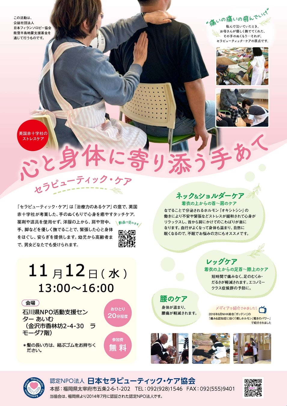 その一環として、このたび金沢市内において、セラピューティック・ケアを紹介する短時間の無料講習会や、実際にケアを受けられる体験会を企画しました。