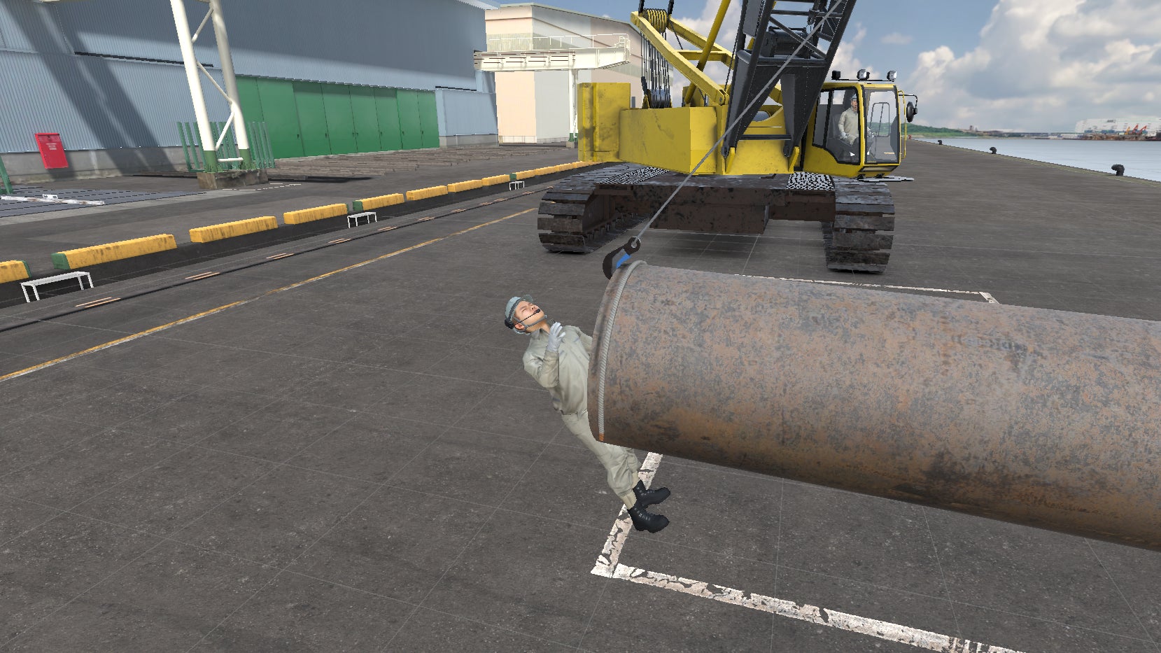 「KYトレーニングVR」では、作業内容の確認、危険予知、指差呼称による安全確認の流れをVR体験で実践します。鋼管玉掛作業や車両荷台上の作業での安全確認を行ない、危険個所の指摘が漏れた場合には被災体験をします。指差呼称を行なうことで動作が記憶され、ヒューマンエラーをなくし、事故、災害が少なくなります。