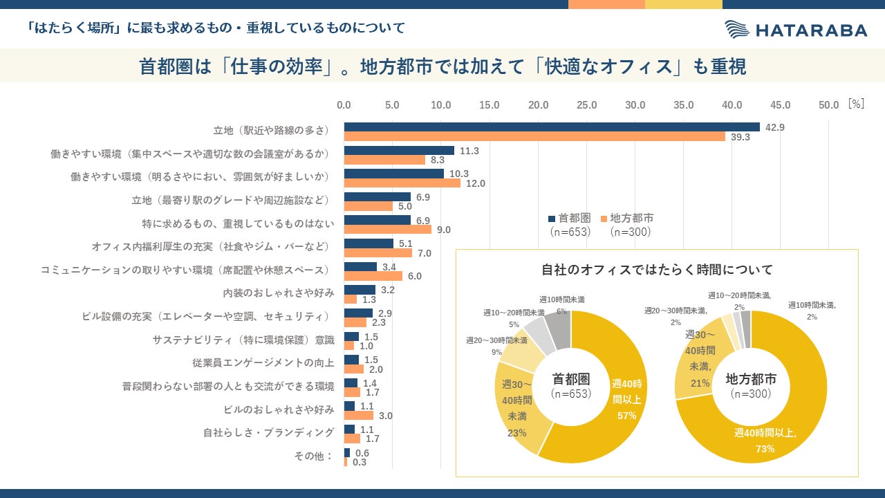 オフィス移転コンサルティング、オフィス仲介サービス、物件検索サイト「HATARABAオフィス」など、“はたらく場所”の最適化を目指す株式会社HATARABA(本社:東京都渋谷区、代表取締役:森村泰明)は、2024年11月にオフィスワーカー953名を対象に「働き方に関する意識調査」を実施しました。その結果、首都圏と地方都市の働き方や働く環境における具体的な違いが浮き彫りになりました。