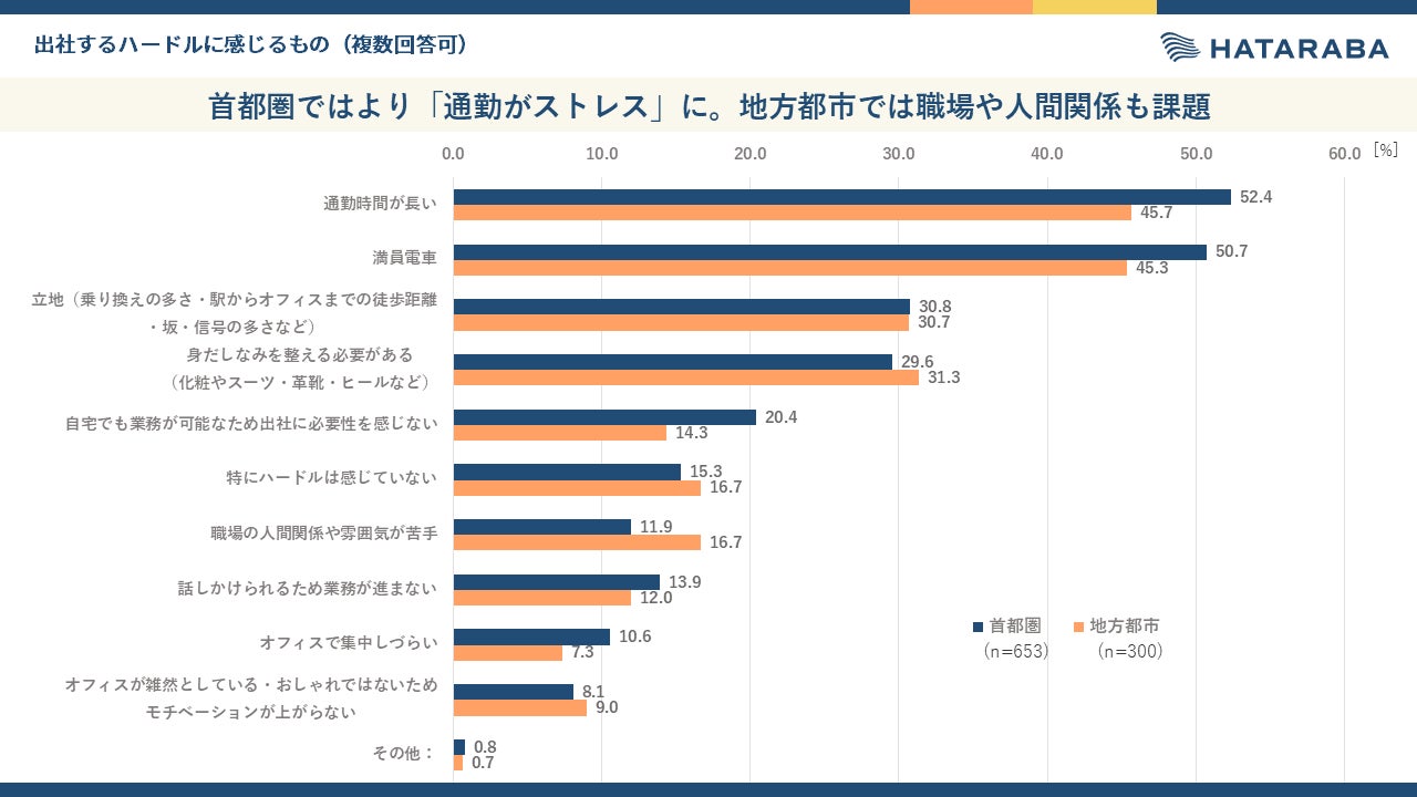 出社におけるハードルとして、首都圏・地方都市ともに「通勤」が最も大きな負担となっていることが明らかになりました。しかし、地域ごとに異なる課題も浮き彫りになりました。