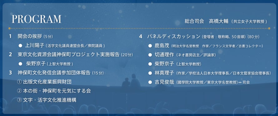 共催:神保町文化発信会議(構成団体:50音順 活字文化議員連盟、出版文化産業振興財団(JPIC)、東京文化資源会議、本の街・神保町を元気にする会、文字・活字文化推進機構、読売新聞社)