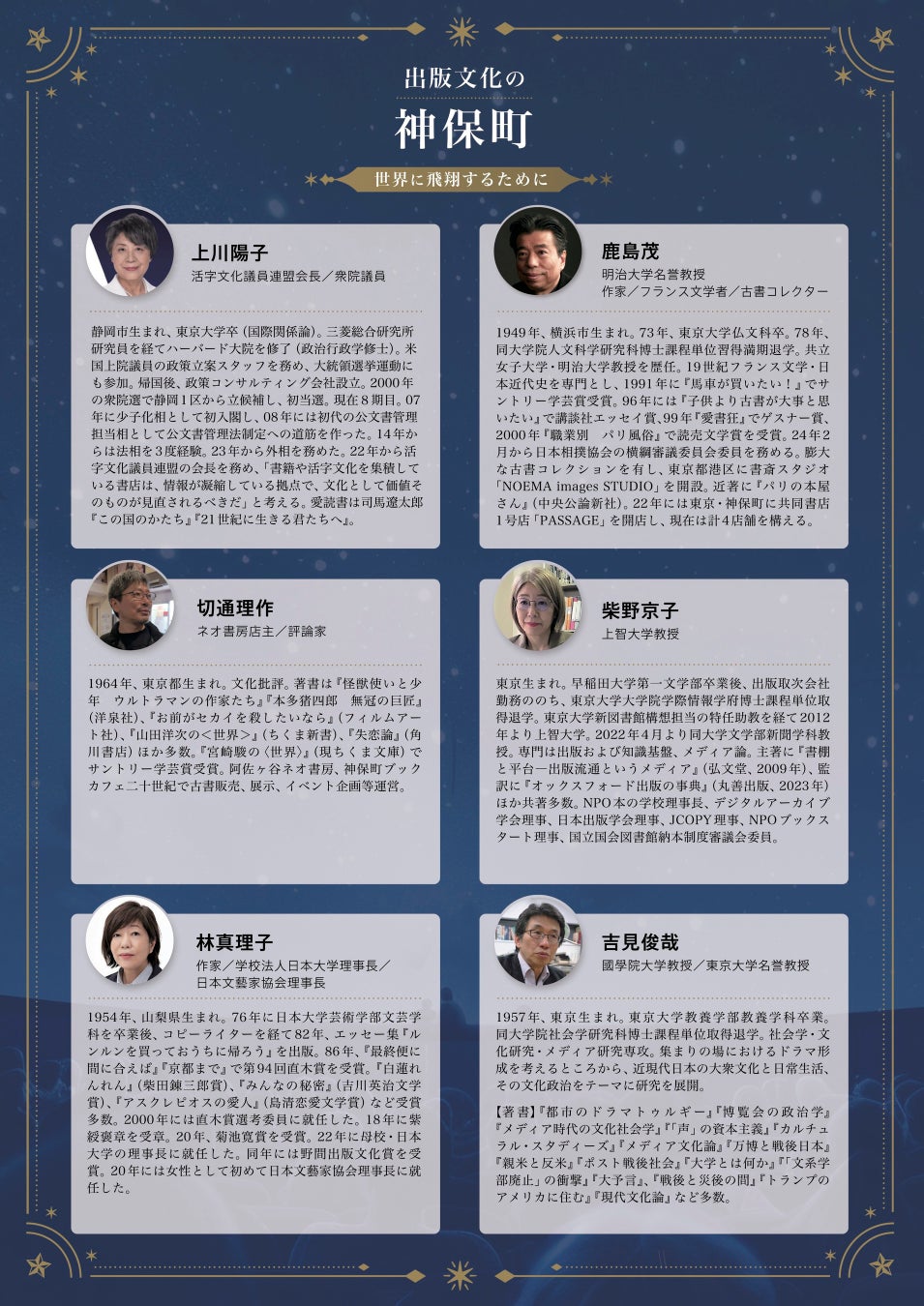 出版文化の中心地・神保町を舞台に、未来の活字文化と街づくりを語り合う特別な一夜。作家や学者、出版業界のリーダーたちと一緒に、知と文化の魅力を発見してみませんか?