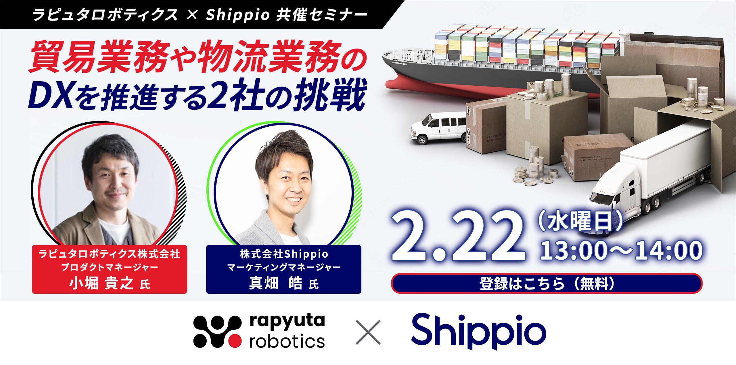 国際物流DXに取り組むShippioと、倉庫業務のDXに取り組むラピュタロボティクスが、貿易から倉庫・出荷までのデジタル化の最新動向を各社の最新サービスや事例を交えてご紹介します。