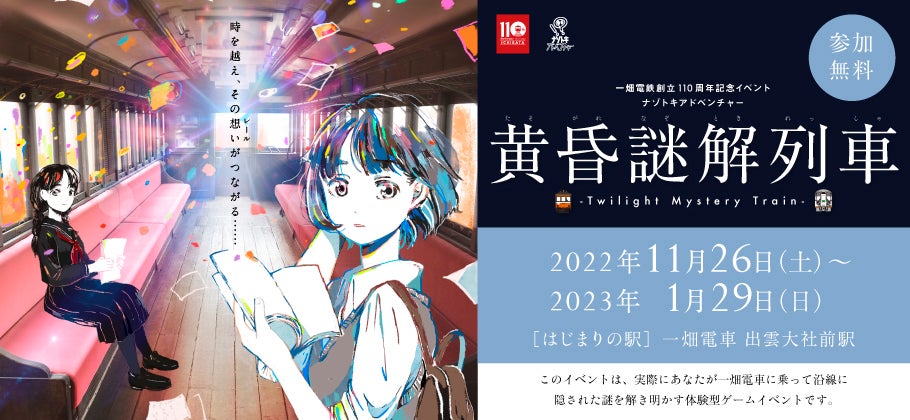 一畑電車(本社:出雲市平田町 代表取締役社長:福富茂人)では、2022年11月26日(土)より、観光庁による地域一体となった観光地の再生・観光サービスの高付加価値化事業の補助金を活用し、以下のとおりのイベント「黄昏謎解列車(たそがれなぞときれっしゃ)」を開催いたします。本イベントは、本年1月に1ヶ月間開催し、地域の皆様にご参加いただきご好評を得た「謎解き宝探しトレイン」に続く、一畑電車に乗って楽しむ第二弾の謎解きイベントとなります。