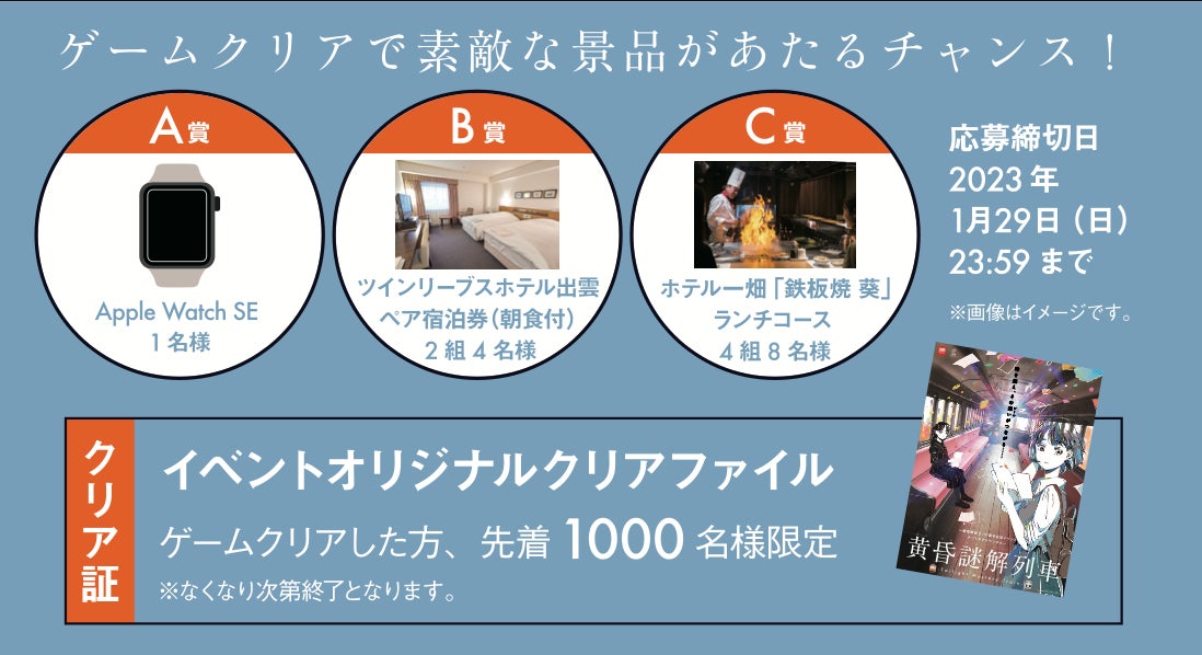 ゲームクリアし、アンケートに回答いただいた方にはApple Watch SE(1名様)、ツインリーブスホテル出雲ペア宿泊券(2組4名様)、ホテル一畑「鉄板焼 葵」ランチコース(4組8名様)を抽選でプレゼント。またゲームクリア先着1,000名様にはクリア証として、イベントオリジナルクリアファイルをプレゼントいたします(なくなり次第終了)。