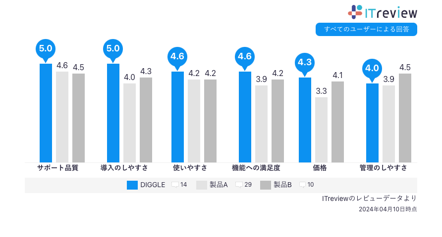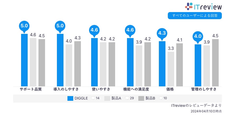 それぞれにおいて、ユーザーが5点満点で満足度のスコアをつけます。「DIGGLE」は、全体の平均点が4.7で、特に「導入のしやすさ」「サポート品質」が満点の5点と高評価をいただきました。