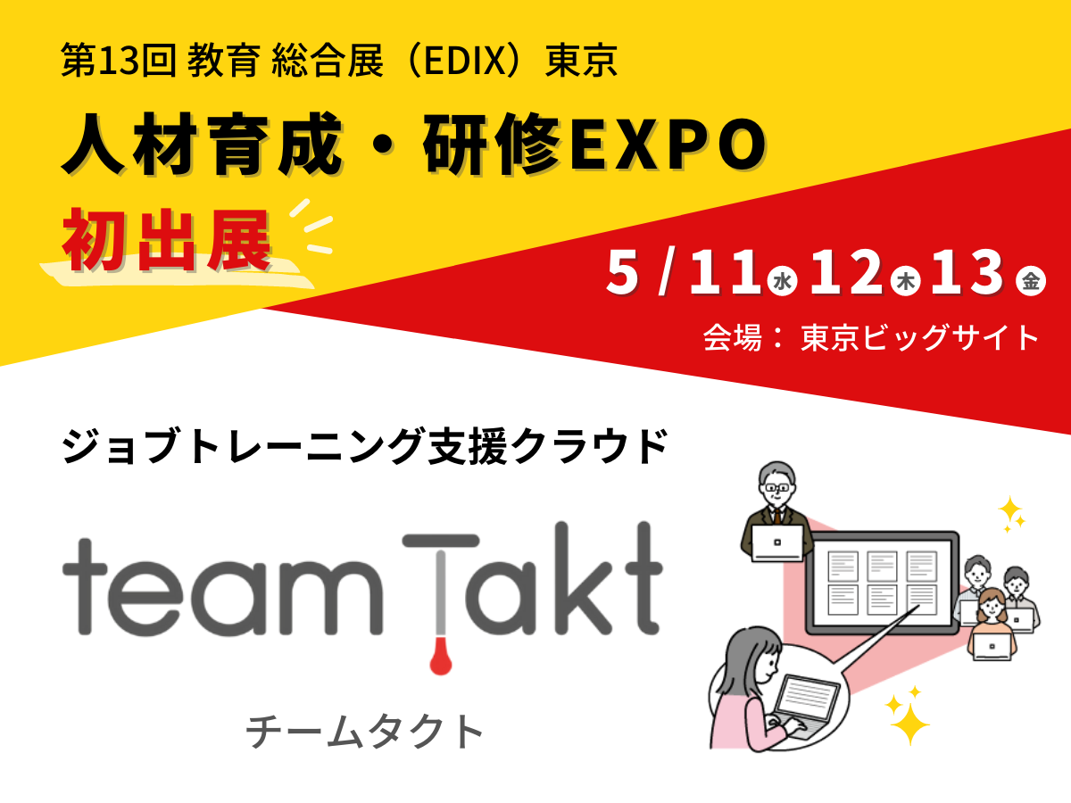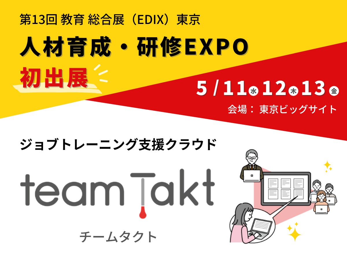 株式会社コードタクト(本社:東京都渋谷区、代表取締役:後藤 正樹、以下「当社」)のジョブトレーニング支援クラウド「チームタクト」は、5月11日(水)~13日(金)に東京ビッグサイトで開催される第13回 教育 総合展(EDIX)東京の人材育成・研修 EXPOに初出展します。