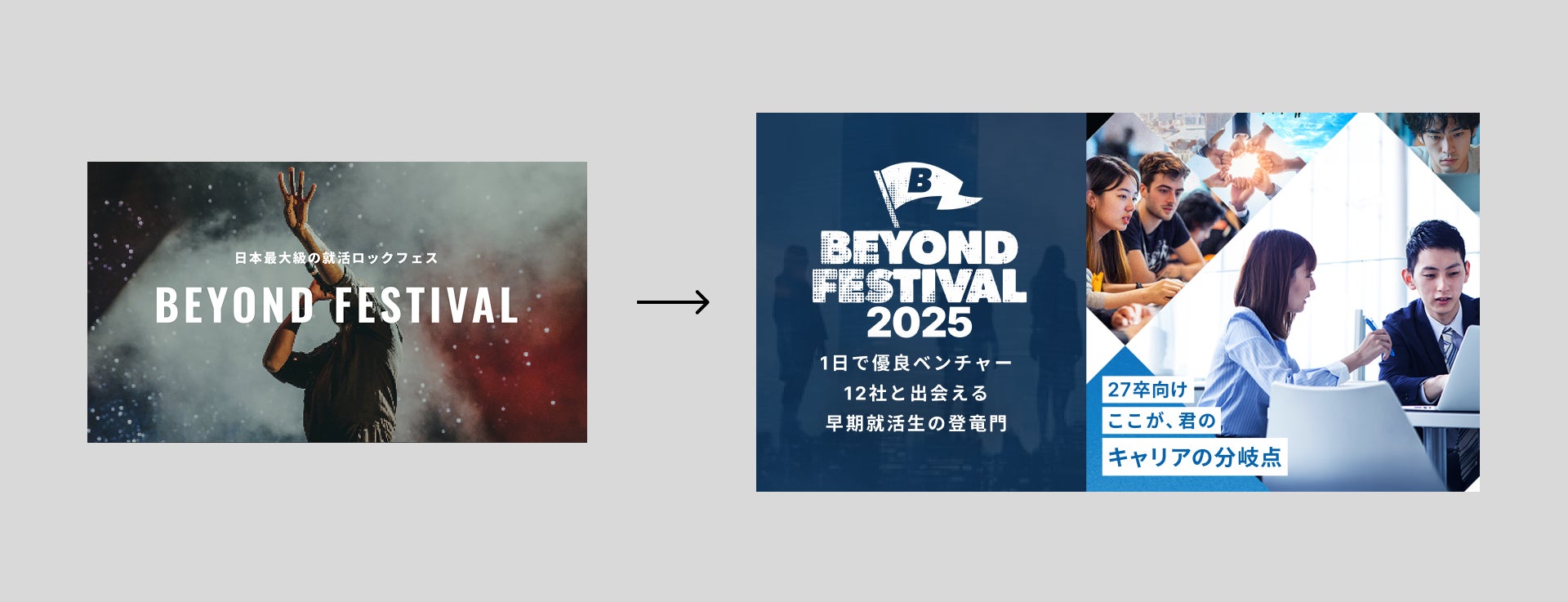 近年、日本の新卒学生が大手企業だけでなく、ベンチャー企業やスタートアップに興味を持つ傾向が強まっている変化を受け、BEYOND FESTIVALを多様なキャリアの選択肢を提供する場として進化させる意思を込めて、ブランドコンセプトを「ベンチャーの祭典」に刷新しました。