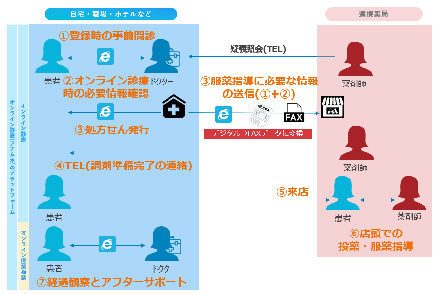 ※本サービスは、新型コロナウイルスの感染拡大を受けて、時限的・特例的な対応として「新型コロナウイルスの感染拡大に際しての電話や情報通信機器を用いた診療等の時限的・特例的な取り扱いについて」(令和2年4月10日に厚労省医政局医事課、医薬・生活衛生局総務課事務連絡(通称「4月10日事務連絡」)に基づき、実現しております。