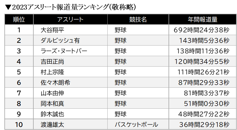 ニホンモニター「2023アスリート報道量ランキング」「2023競技別報道量TOP3」