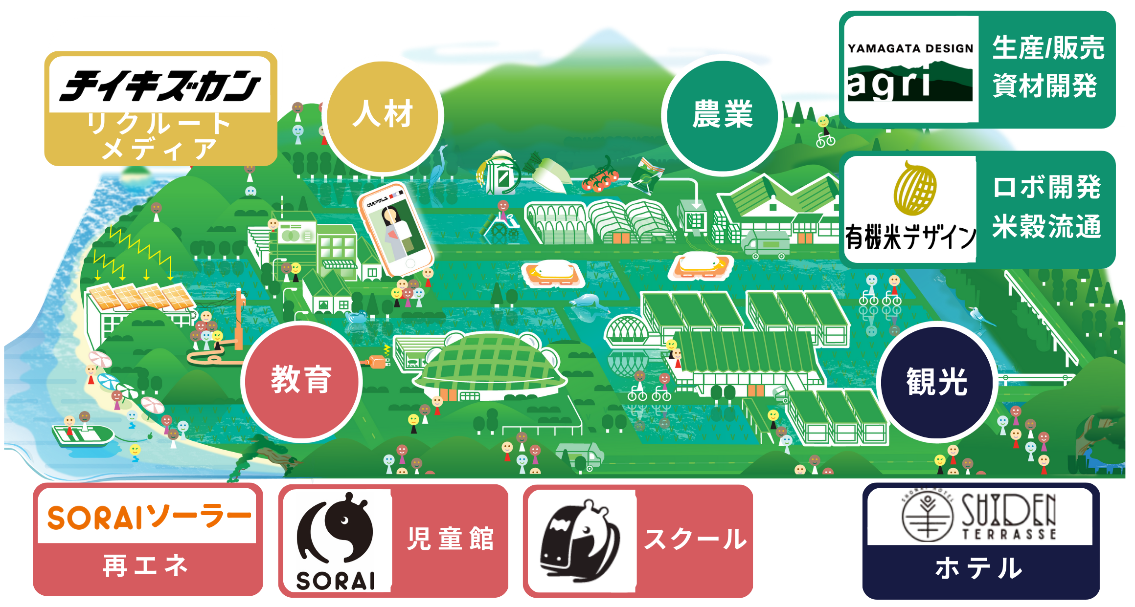 地方都市の課題を希望に変える街づくり会社。山形庄内から全国にも展開可能な課題解決のモデルづくりに挑む。田んぼに浮かぶ 木造ホテル「スイデンテラス」、天性重視個性伸長の教育施設「キッズドームソライ」、リクルートメディア「チイキズカン」、有機農作物の生産、資材開発、販売、アイガモロボの開発などの各種街づくり事業を手掛ける。2022年、ニッポン新事業創出大賞で経済産業大臣賞、地方創生賞をW受賞、日本サービス大賞で地方創生大臣賞を受賞。
