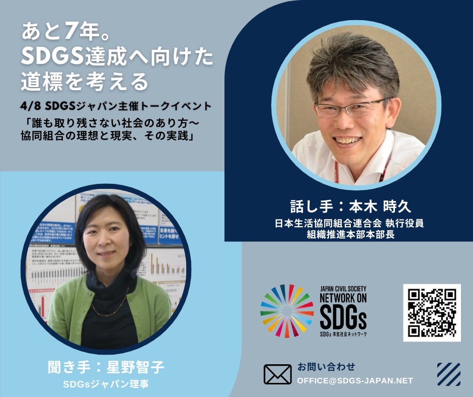 一般社団法人SDGs市民社会ネットワーク(SDGsジャパン)は、「誰一人取り残さない」とは、「誰」なのか、「どのように取り残さないのか」、さまざまな視点から考える、リレートーク「あと7年。SDGs達成へ向けた道標を考える」を開催します。第2回は、SDGsジャパン理事でもあり、日本生活協同組合連合会 執行役員の本木時久さんを迎え、協同組合の精神にある誰も取り残さない社会のあり方と生協活動を参考に今の社会課題にどう向き合えば良いのかを考えます。