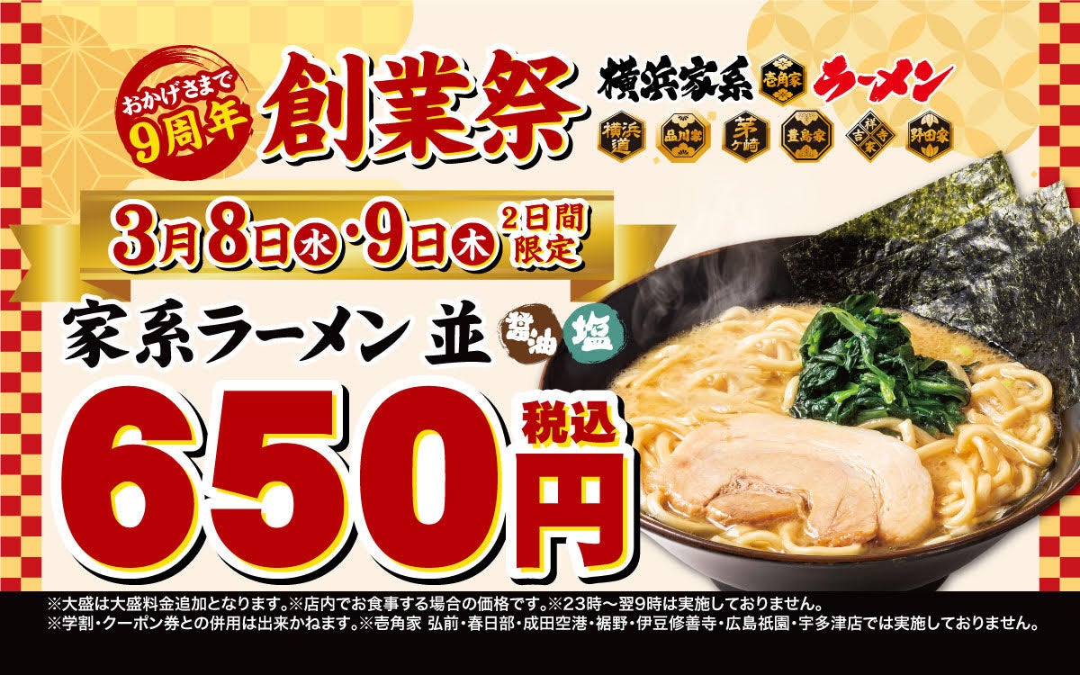 壱角家9周年を記念し『壱角家創業祭』を開催 2日間限定で『家系ラーメン』を税込650円で提供