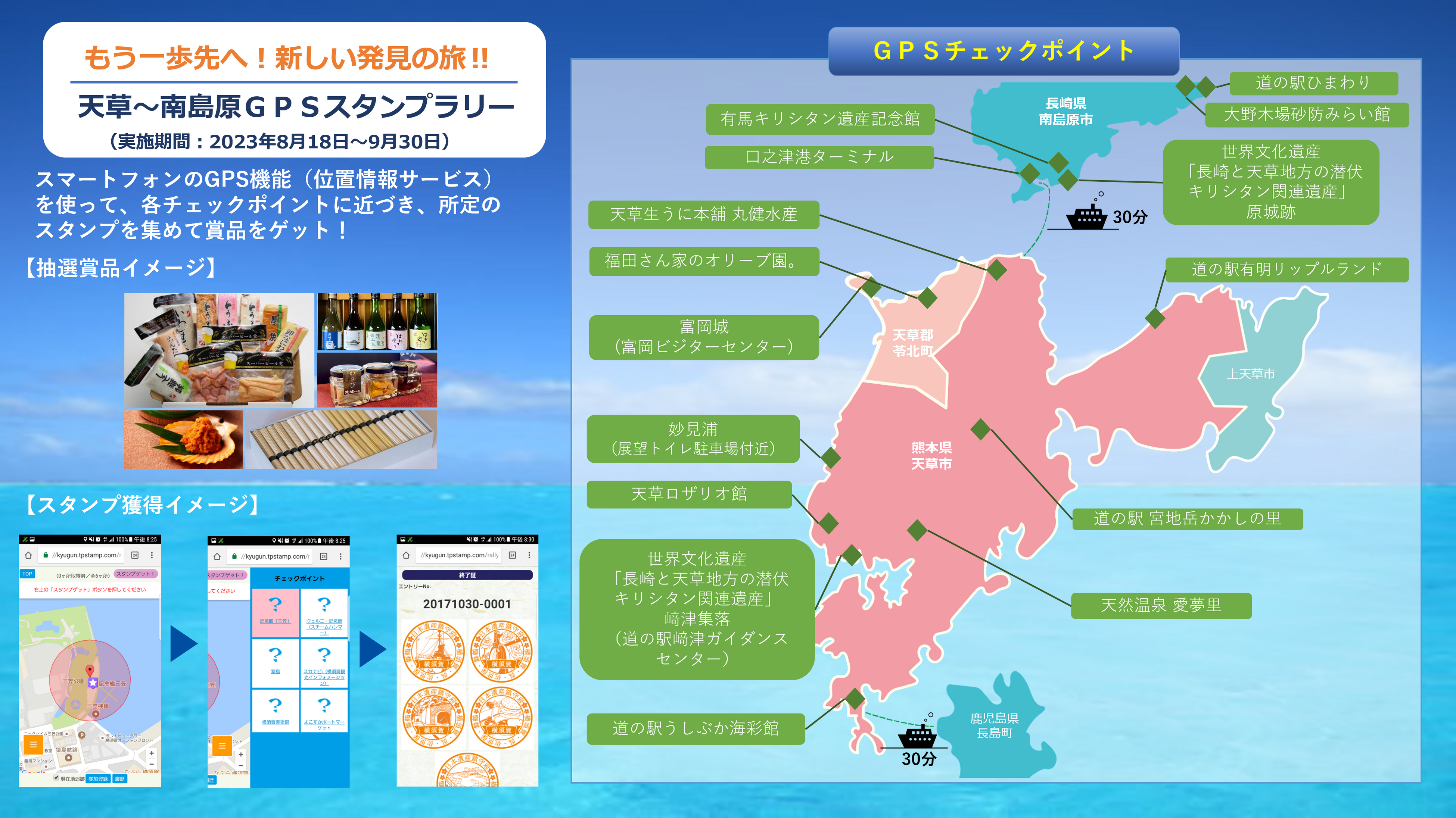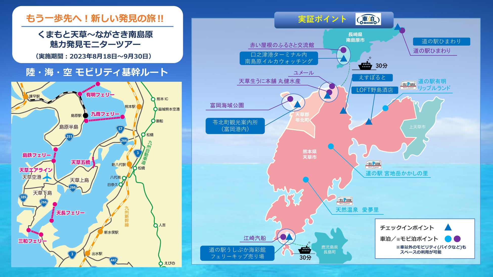 2023年8月18日より、熊本県天草市・長崎県南島原市の行きたい地域にマイカーやレンタカー、キャンピングカー等を使った周遊・滞在をしていただく1泊2日のモニターツアーと、どなたでも参加が可能なGPSスタンプラリーを同時開催いたします。