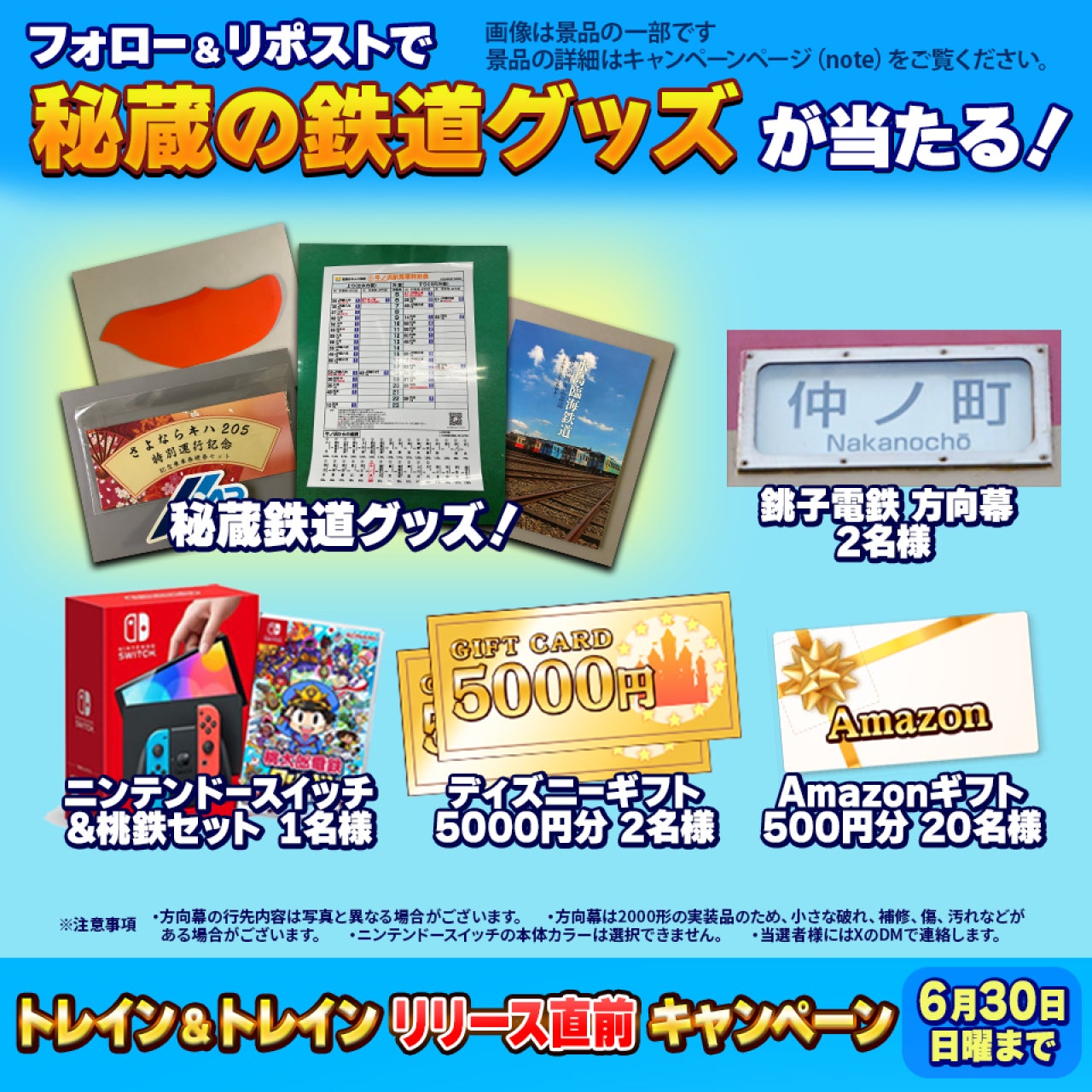 「トレイン&トレイン」公式X( @TRAIN_CEO )では、プロジェクトTのさらなる拡大を目指して、全国の鉄道事業者との合同で、秘蔵の鉄道グッズやNintendo Switch、Amazonギフト等が当たるプレゼント企画を実施します。