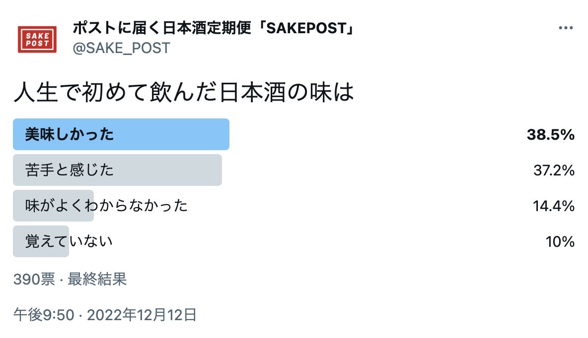 さらに、人生で初めて飲んだ日本酒の味について同様にアンケートをとった結果、「美味しかった」と「苦手と感じた」の相反する経験がおよそ同数で2分する結果となりました。
