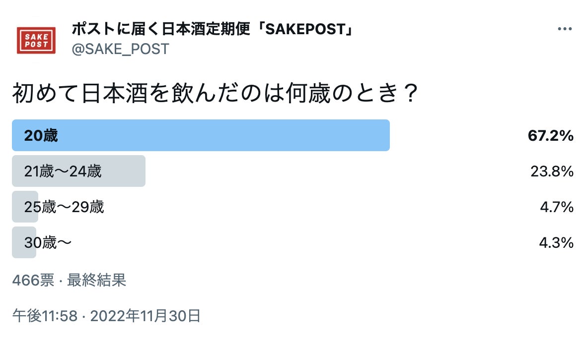 Twitter経由でアンケートをとった結果、初めて日本酒を飲んだ年齢は20歳という答えが全体の2/3以上と多数を占めており、それ以外の回答でも20代前半には1度は日本酒を味わう機会が多いようです。
