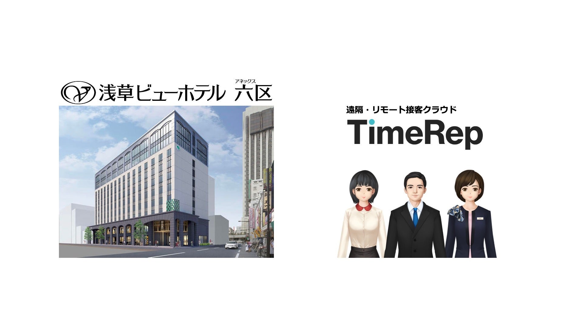 with/afterコロナ時代となり経済活動再開による企業業績の回復とともに、人手不足が企業経営における最重要課題の一つとなっています。またインバウンド旅行客の回復も顕著となっており、いかに顧客満足度をあげて売上アップを実現するかも重要な課題となっております。このような状況下で、遠隔・リモート接客クラウド「TimeRep」を活用し、スタッフが複数の窓口、客室からの問い合わせ対応を担当することで、ホテルにおける省人化・無人化を実現し、同時にインバウンド対応を実現することが期待されており、今回、浅草ビューホテル アネックス 六区への導入が決定いたしました。