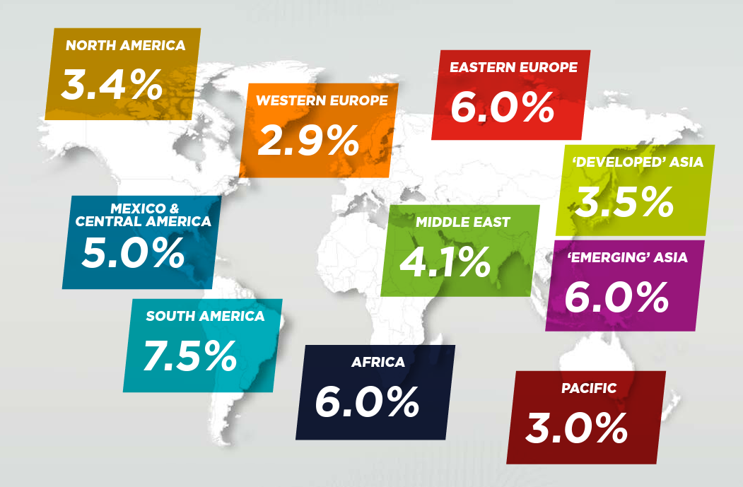 - 西ヨーロッパでは2.9%、太平洋地域では3.0%、北米では3.4%の昇給が見込まれるのに対し、東ヨーロッパ、アフリカ、新興ヨーロッパはいずれも6%、南米は7.5%と世界的に最も高い昇給を見込んでいる。