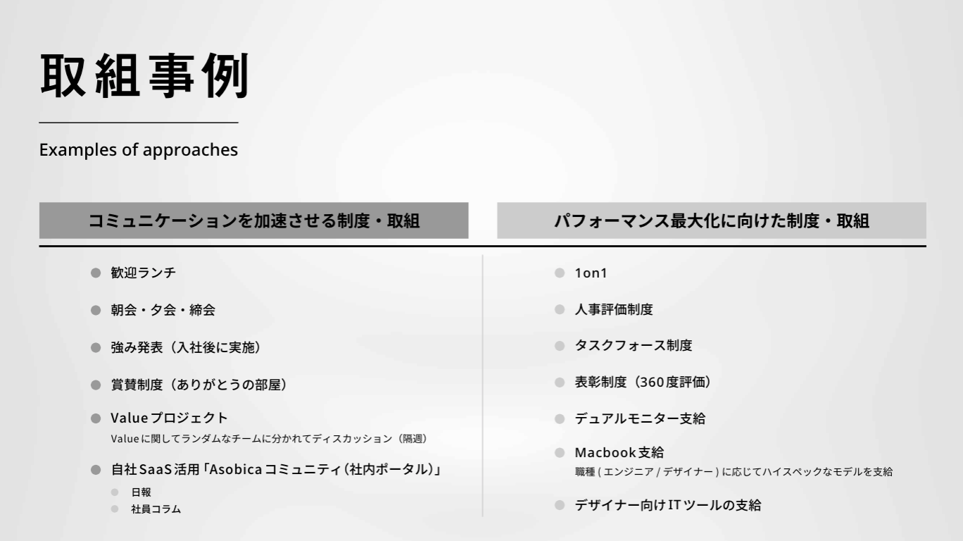- 従業員エンゲージメントの向上につながる取り組み事例や、Asobicaのミッション&バリュー