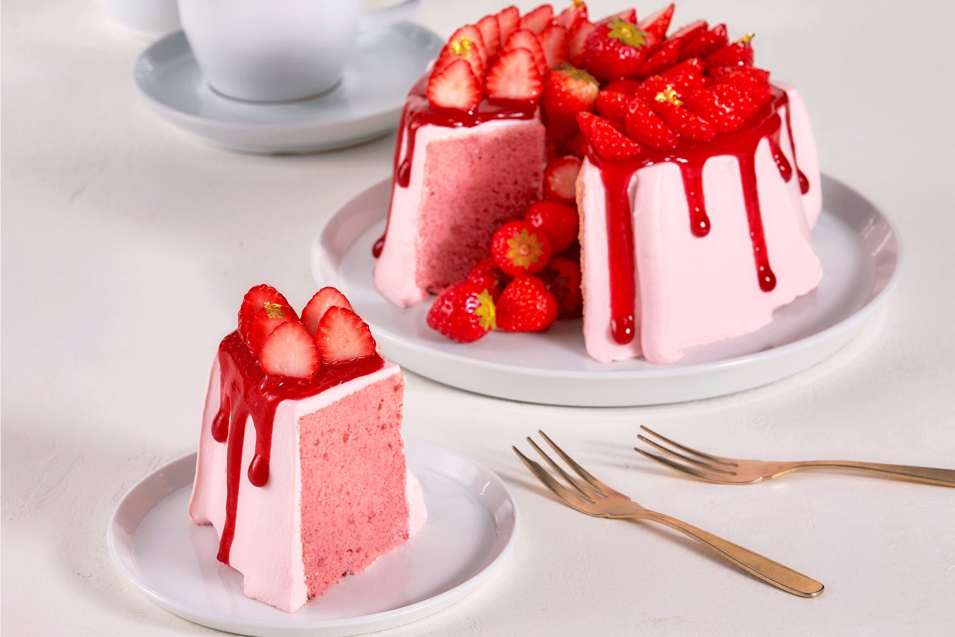 米粉と卵白を使用した、MERCER bisならではの"ふわもち食感"のシフォン生地に、自家製ラズベリージャムとクランベリー果肉を加えてアレンジ。ストロベリーシロップを合わせたオリジナルブレンドの生クリームでやさしくシフォンを包み込み、あまおう苺を贅沢に使用したソースを合わせて春らしい色合いに仕上げました。